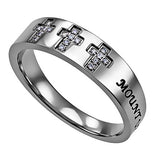 Stunning high polish band stainless steel ring set with 3 cz crosses. Engraved black enamel wraps band reading “Mount Up With Wings As Eagles – Isa. 40:31". Band width measures a mere 6mm front tapering to 3mm back. Free Shipping