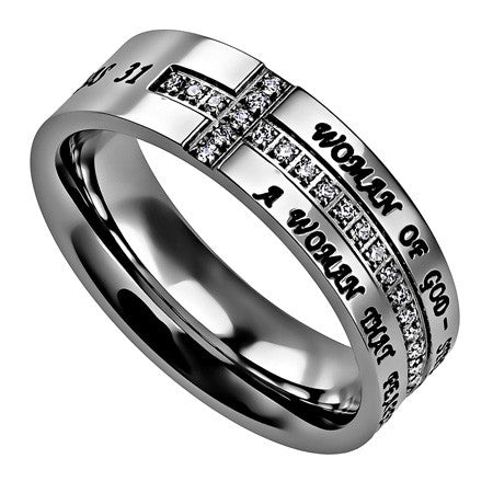 Stunning high polish band stainless steel ring. Set CZ stones wrap almost entire cross. Top and bottom engraved black enamel filled writing reads “Woman Of God – Strength, Honor, Wisdom, Kindness – A Woman That Feareth The Lord, She Shall Be Praised – Prov. 31". Band width measures a mere 6mm. Free Shipping