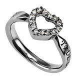 Stainless steel petite band cubic zirconium stones surrounding cut out heart. Engraved scripture with black enamel filling on back side of ring, “True Love Waits – 1 Timothy 4:12” Free Shipping
