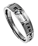 Stunning high polish stainless steel band tapers from a petite 6 mm top to a 4 mm back. Within cut out cross is grip set a solitaire cubic zirconium clear stone. Black enamel filled engraving wraps entire band from one end of the cross to the other reading "I Am My Beloved's And He Is Mine - SOS 6:3". Free Shipping